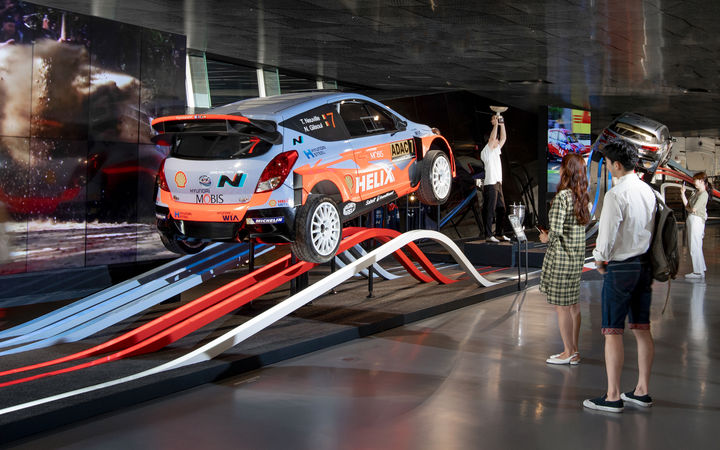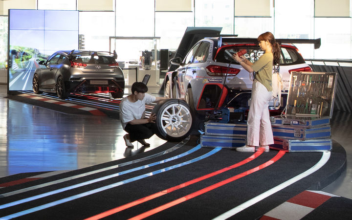感知并感受:游客將在此沉浸于速度和刺激的世界中。本展覽呈現(xiàn)了現(xiàn)代汽車的N系品牌 - 從拉力賽車和旅行車直到公路車輛。在現(xiàn)代,N系品牌代表著跑車駕駛的體驗(yàn)。這里主要的設(shè)計(jì)元素是一個(gè)動(dòng)態(tài)的賽道上展示四輛N系車型:它們仿佛即將跳躍或進(jìn)行大膽的傾斜轉(zhuǎn)彎,并在其后方拉出一道光束。